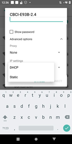 4 Select the SSID of your access point. Type your network's password. Touch "Advanced options" > "IP Settings". Touch "DHCP" and select "Static".